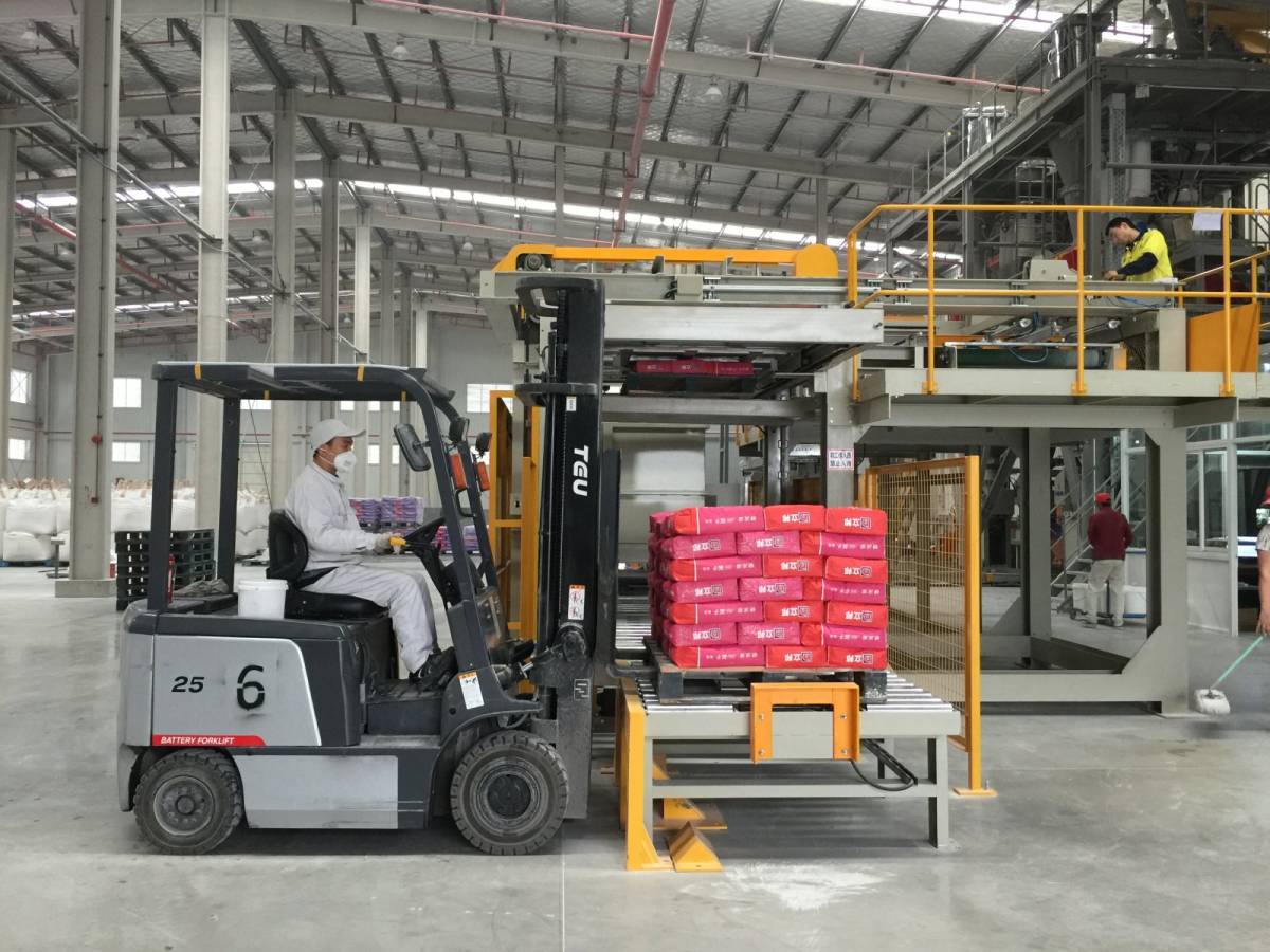 将编组后的料袋,通过分层机,码放在垛盘输送机的托盘上。